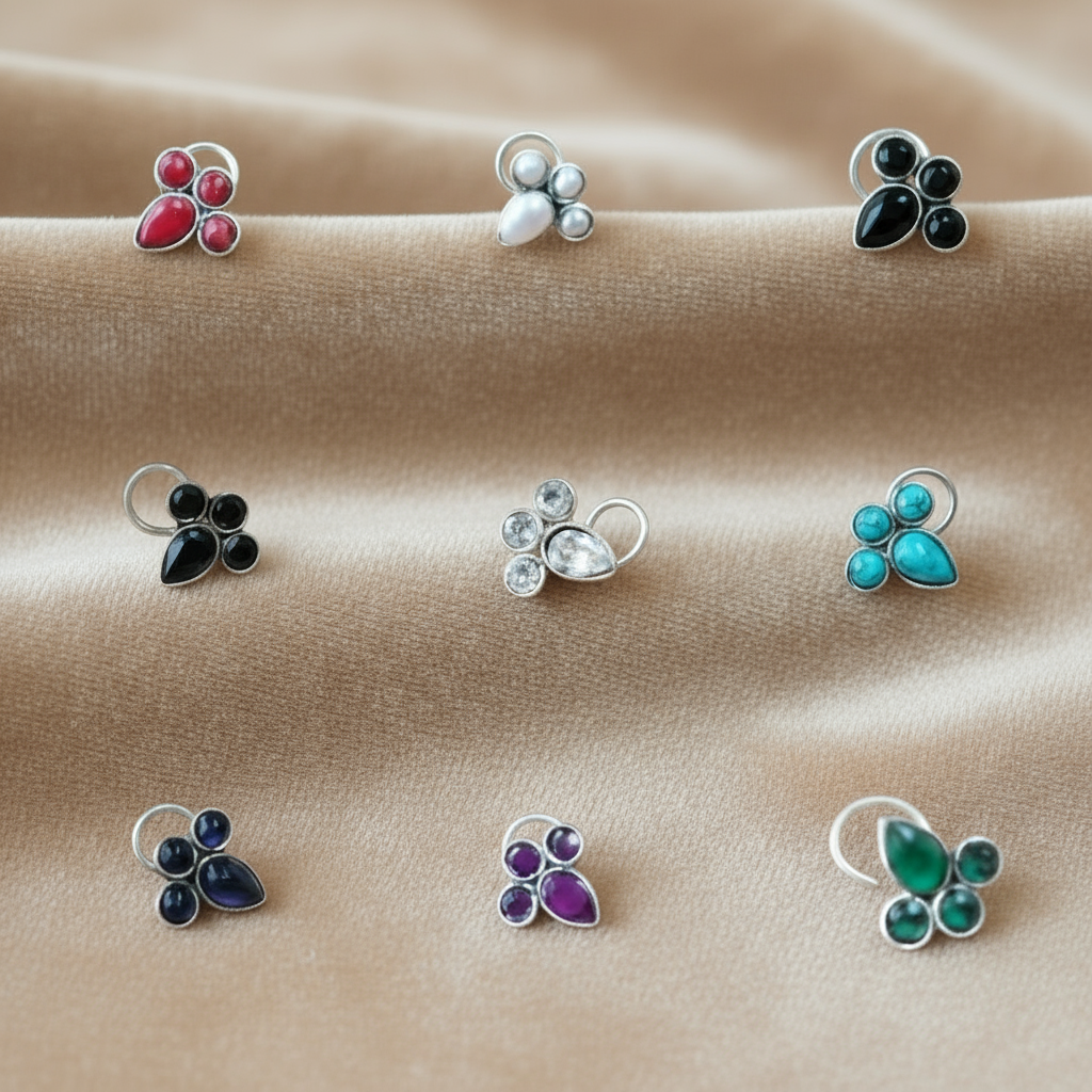 - All our Nose Pins are handmade in 92.5% Sterling Silver with Semi Precious Gem Stones